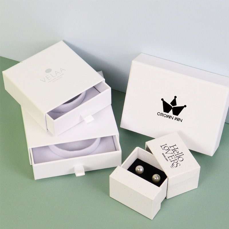 Crown Win's premium white card velvet lined jewelry box prevents gemstones/pearls from scratching. Customizable printing is the ideal choice for jewelry brand packaging needs.