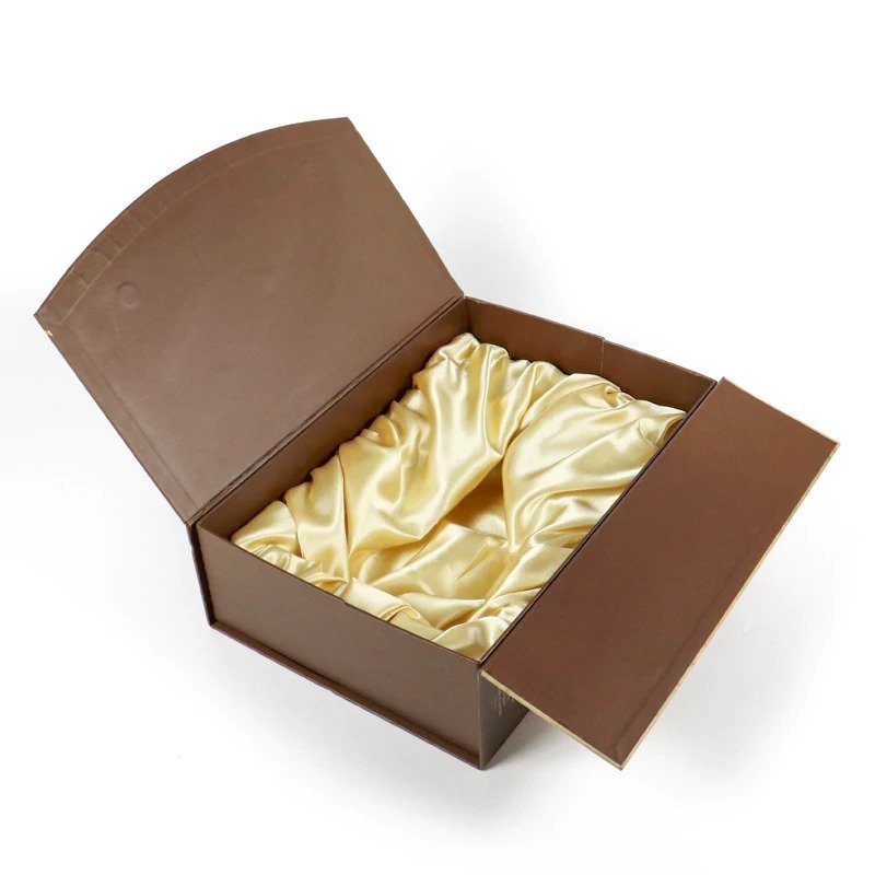 Elevate your wine packaging with this double-door box featuring gold foil printing and a luxurious satin lining. Customizable for a premium, secure, and elegant presentation of your finest wines.