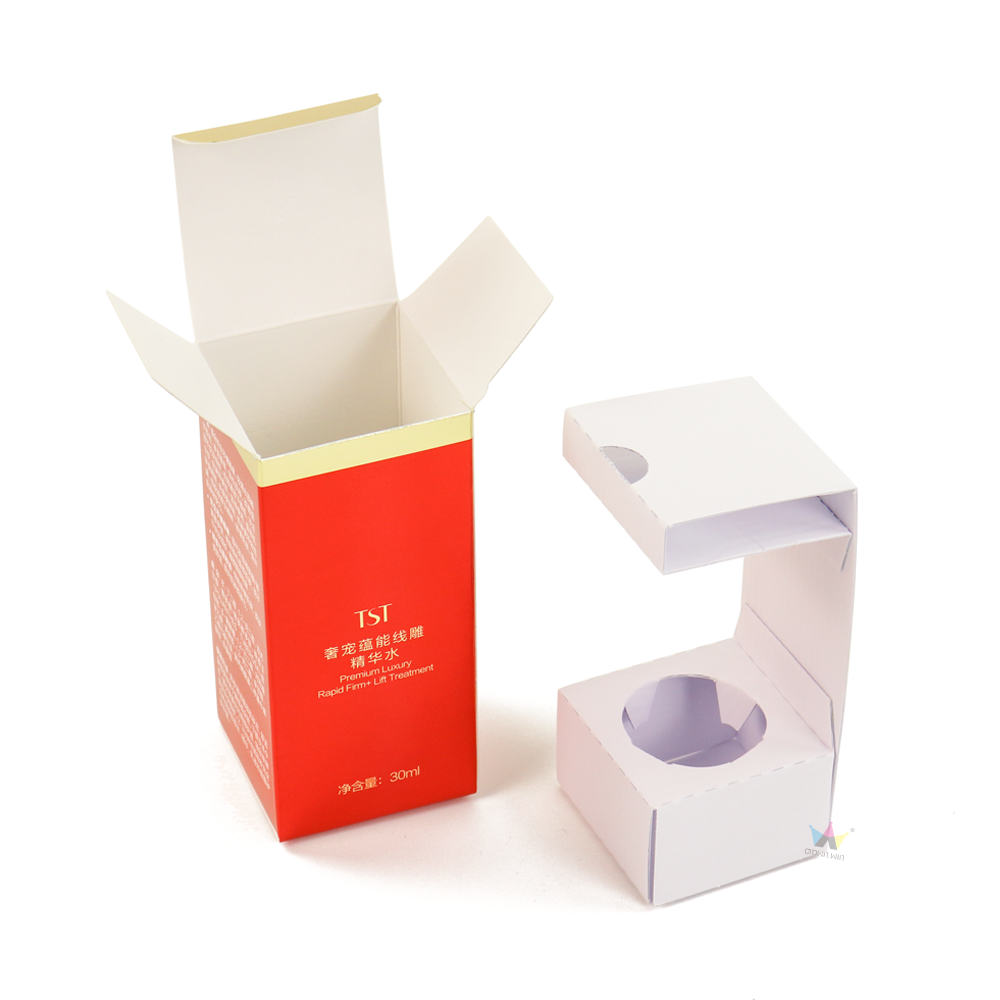This premium foldable skincare packaging box from Crown Win manufacturer is made of 350g premium red coated cardboard, lightweight and durable, while maintaining a high-end luxury appearance while reducing transportation costs and storage space. The packaging box adopts full-color offset printing, presenting a bright red color, and highlights the brand logo and product information with hot stamping technology, creating a striking high-end appearance and showcasing the excellent quality of the product. The customized paper lining tightly adheres to the body of the skincare bottle, preventing scratches and damage during transportation; The foldable design facilitates flat packaging transportation and can save up to 60% of logistics costs.