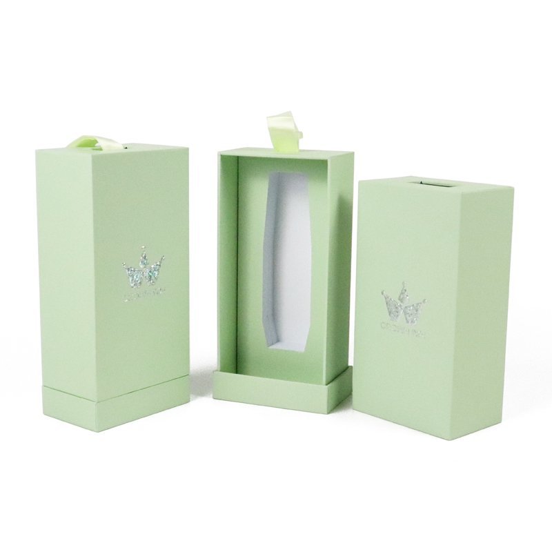 This advanced drawer type perfume packaging box from the Crown Win manufacturer is made of 1200g light green coated cardboard, which is durable, fresh and elegant in appearance. The crown logo adopts holographic hot stamping technology to create a dazzling and high-end visual effect. The customized EVA lining can closely fit the bottle to prevent scratches and damages during transportation. The light green ribbon pull ring ensures smooth opening and closing of the drawer, and the matte surface is not easy to leave fingerprints.
