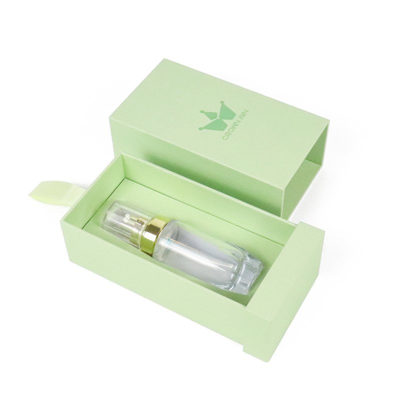 Crown Win's advanced light green cardboard drawer type perfume box (holographic gold stamping, customized EVA lining) can protect perfume bottles. Customizable, it is an ideal choice for perfume and beauty B2B packaging.