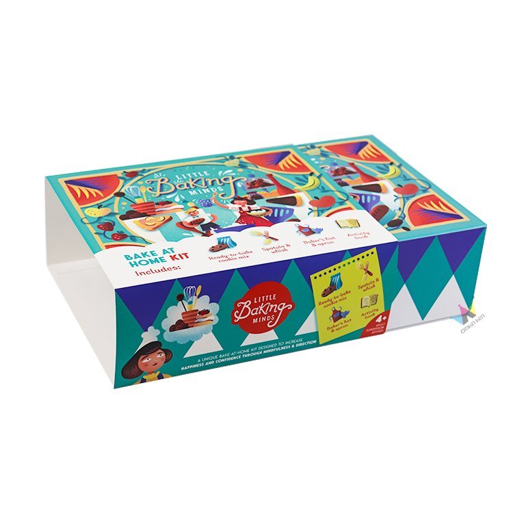 Each packaging box features a vibrant and fun art design that showcases the joy of baking, and is printed in full-color to perfectly showcase your brand or theme illustrations. The sturdy food grade cardboard structure ensures the safety and security of the product during transportation, while the detachable partition facilitates the organization of baking supplies, from mixing bowls to recipe cards, at a glance. The magnetic box cover adds a touch of delicacy, allowing both children and parents to enjoy the fun of unboxing.