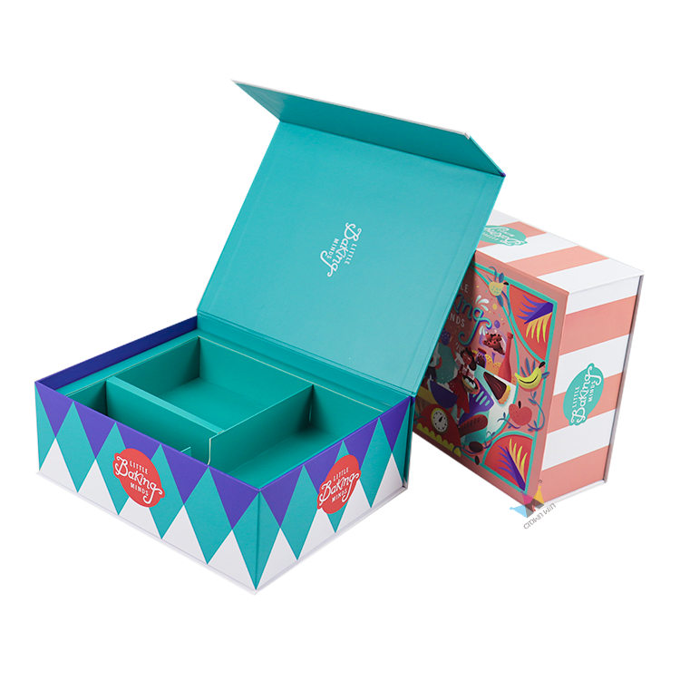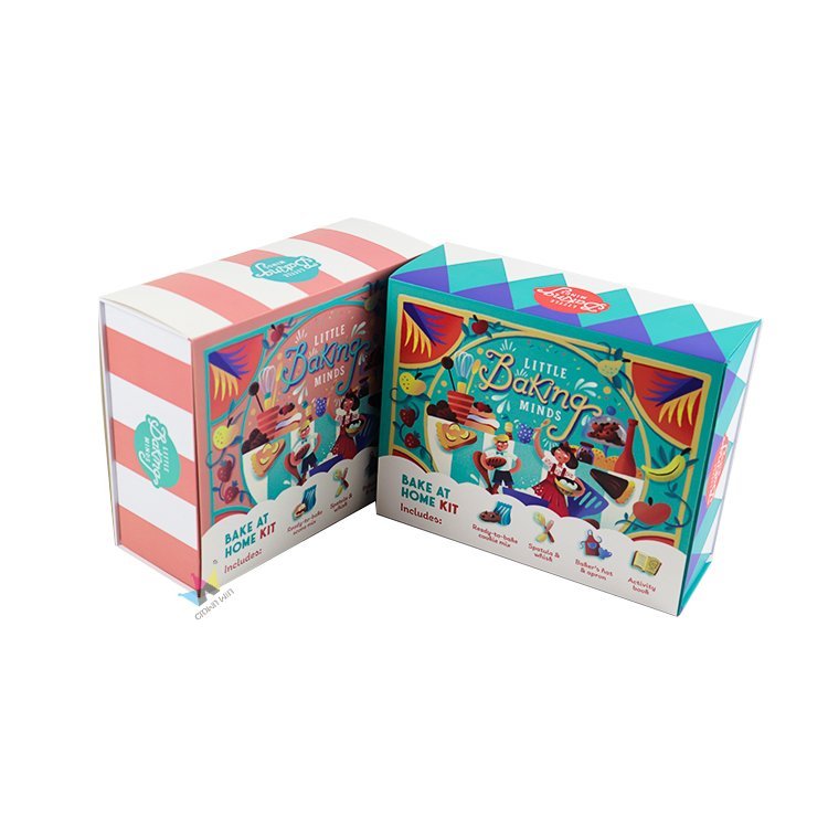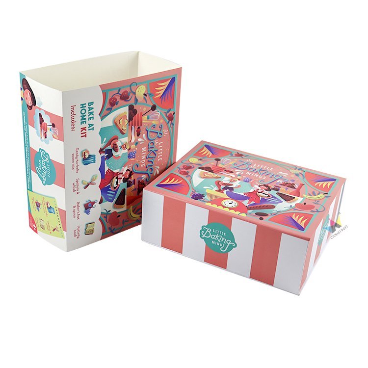 These custom baking packaging boxes are the ideal choice for bakeries, event set brands, or gift retailers, offering unlimited customization possibilities: you can choose eye-catching patterns such as retro stripes or geometric diamonds, add your logo or brand information, and choose lining colors that match your aesthetic style. Whether you are launching a new children's baking subscription service or creating holiday gift boxes, our team will work hand in hand with you to turn your vision into reality - from the initial design sketches to the final production.