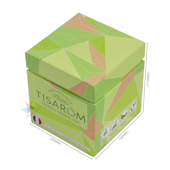 This high-quality two-piece bottom tea packaging box from Crown Win Manufacturer is made of 1200 grams of cardboard, which is sturdy, durable, moisture-proof, and can maintain the freshness of herbal tea bags while also maintaining their fashionable and high-end appearance. The packaging box adopts full-color offset printing, decorated with vibrant geometric patterns in fresh green and peach tones, and accompanied by clear brand logos and product information, creating a striking shelf display effect and showcasing the natural craftsmanship and quality of the product.