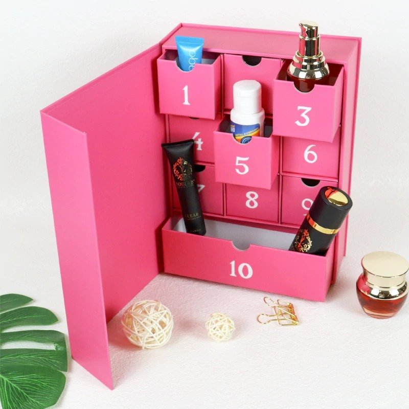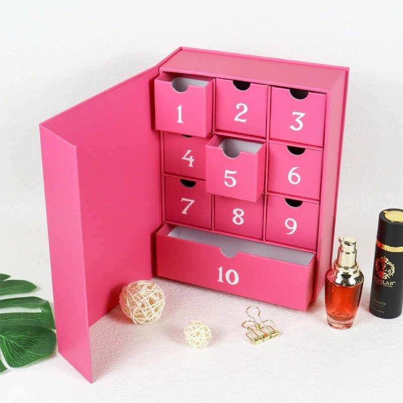 This OEM pink surprise calendar packaging box is designed to deliver a refined and interactive unboxing experience for cosmetic products. The sturdy paper structure and precise drawer design ensure both product protection and premium presen