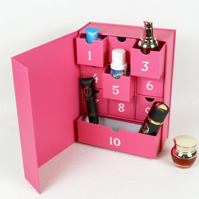 This OEM pink surprise calendar packaging box is designed to deliver a refined and interactive unboxing experience for cosmetic products. The sturdy paper structure and precise drawer design ensure both product protection and premium presentation.