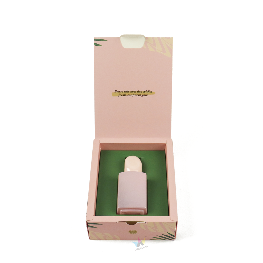 This pink tropical printed perfume gift box set is designed and manufactured by Crown Win Box Manufacturer, which perfectly integrates vitality and beauty with practical functions to enhance the display effect of your beauty products. The outer box features a soft matte pink finish, embellished with tropical palm leaf prints and gold foil, creating a fresh and luxurious visual effect that is highly favored by modern consumers.