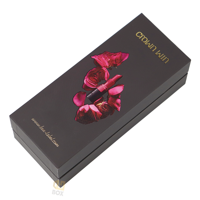 This high-end two-piece lipstick packaging box from Crown Win manufacturer is made of 1200g hard matt black cardboard, which is sturdy and durable in structure, scratch resistant and wear-resistant, and is not easy to deform during transportation and display. Metal gold trim adds a luxurious texture. The packaging box adopts the full-color offset printing process, which is printed with bright rose and lipstick patterns, and the brand logo and website address are printed with the bronzing process to create a sophisticated high-end appearance and highlight the product quality. The customized velvet lining closely fits the lipstick tube body to prevent scratches and damage. The rectangular design makes it particularly eye-catching on retail shelves.