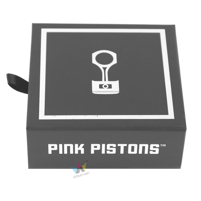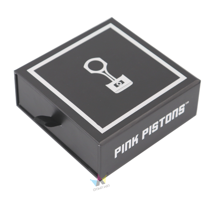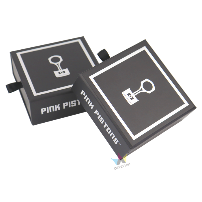 This high-end matte black cardboard drawer box produced by Crown Win Manufacturer is equipped with a custom cut EVA lining that can tightly store car keychains, preventing scratches and damage. The silver foil hot stamping of the brand logo and piston pattern enhances visual appeal, while the black ribbon pull tab ensures smooth opening and closing. It is very suitable for souvenir and keychain packaging in the automotive industry, achieving a balance between protection, uniqueness, and brand recognition.