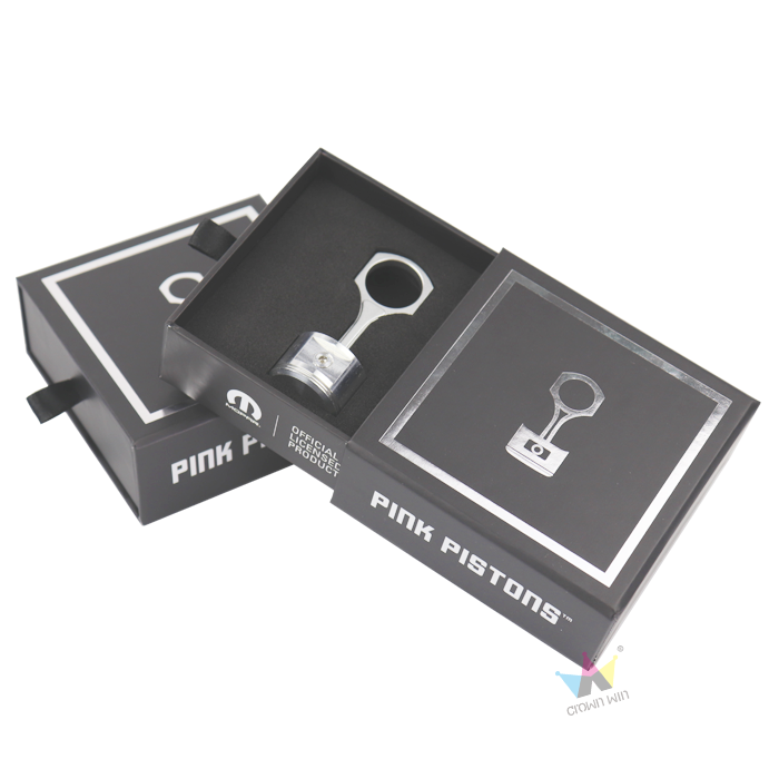 Crown Win's premium matte black cardboard drawer box (EVA lining, silver foil hot stamping) can protect car keychains and can be customized.