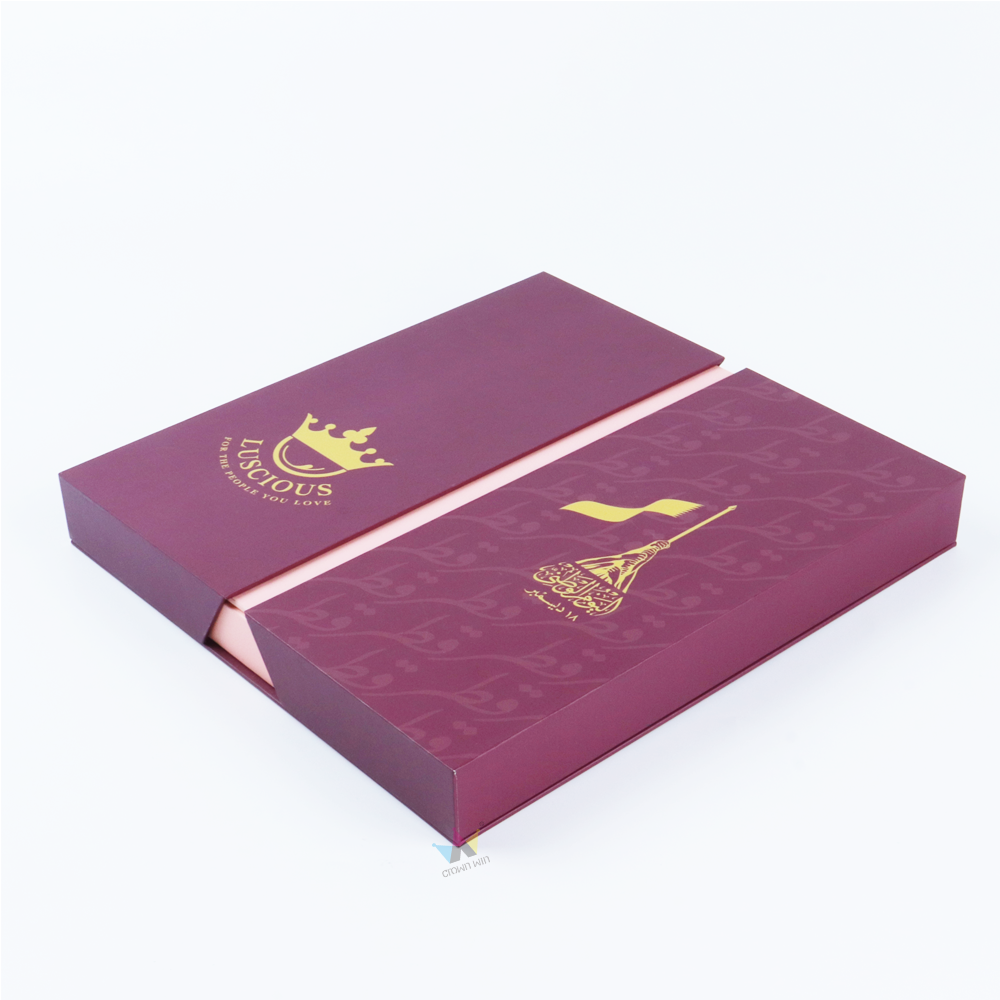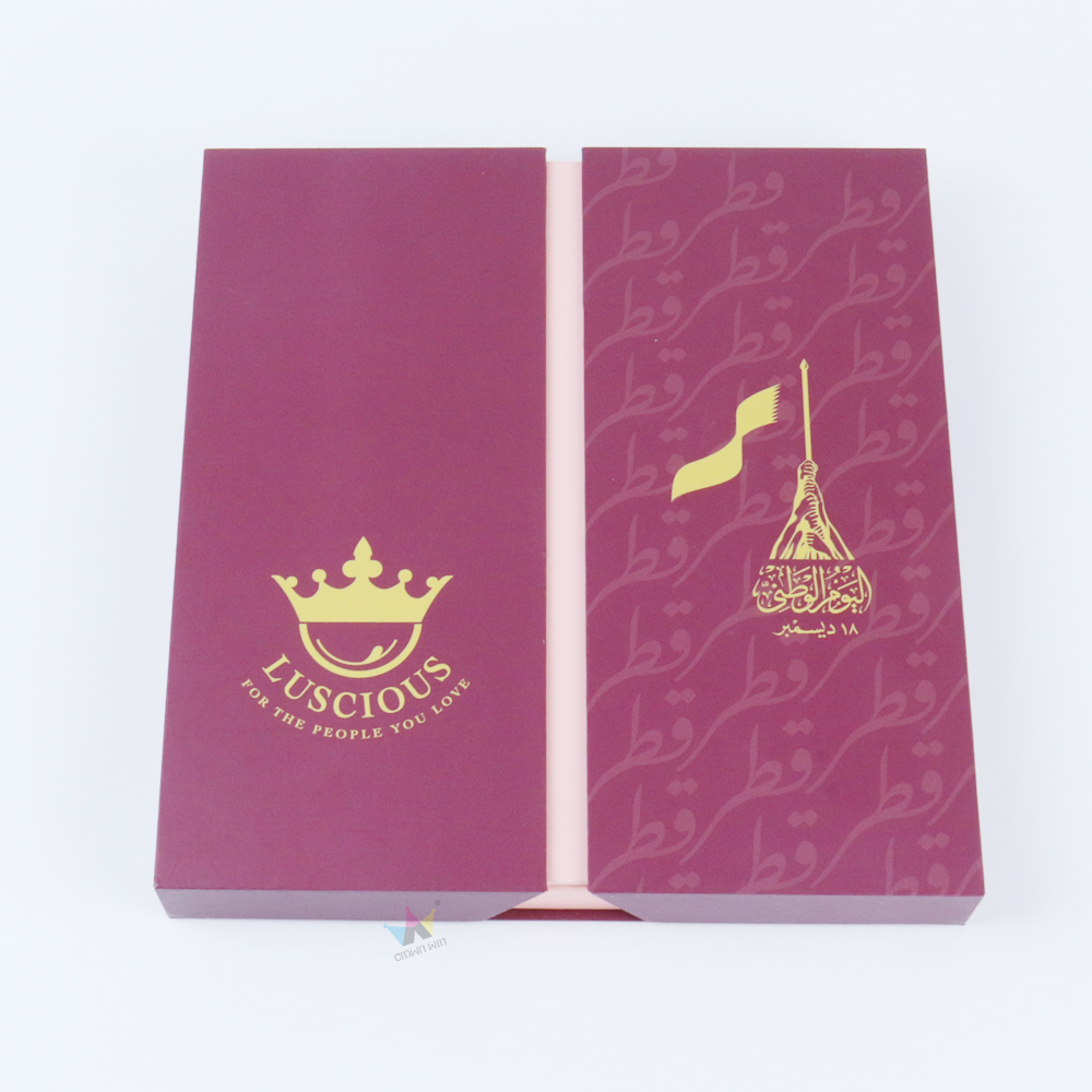 Crown Win's premium wine red cardboard double opening gift box (hot stamping, compartmentalized lining) can effectively protect candies. Customizable, it is the ideal choice for B2B packaging for Middle Eastern festivals.