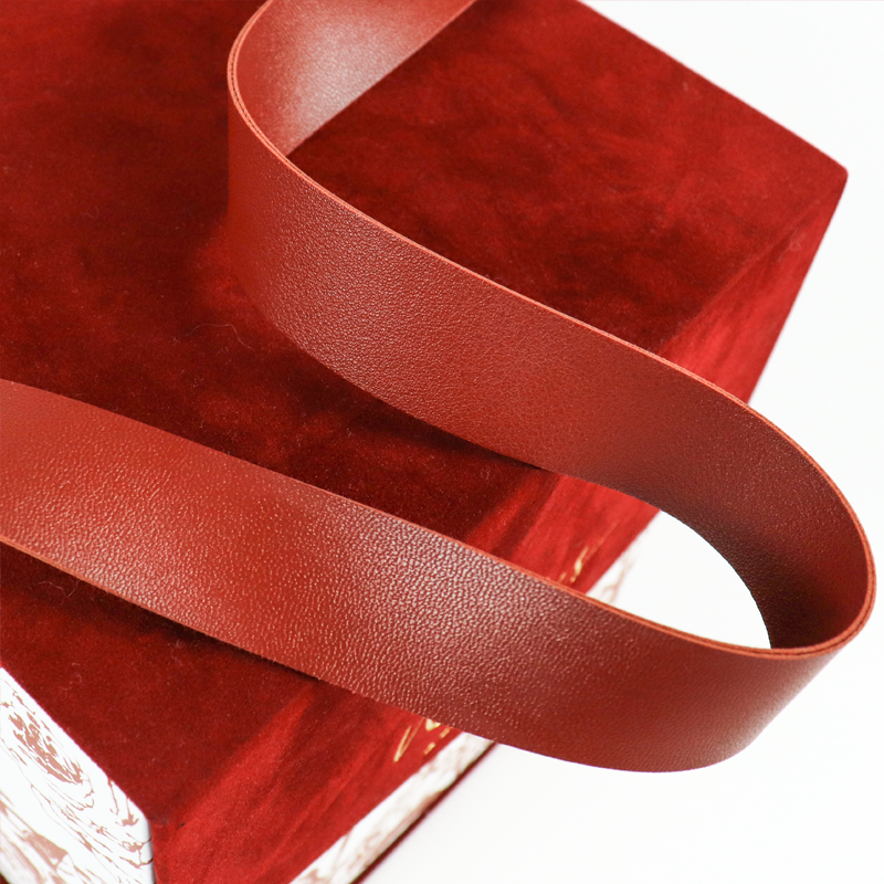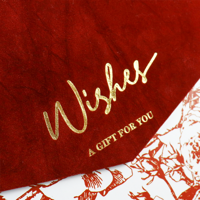 This high-quality red velvet square handle gift box produced by the Crown Win manufacturer is made of soft red velvet fabric and printed cardboard side panels, and is equipped with a sturdy PU leather handle for easy carrying. The gift box adopts hot stamping technology, and the inner lid also adopts hot stamping technology, effectively reflecting the theme of festivals or flowers.